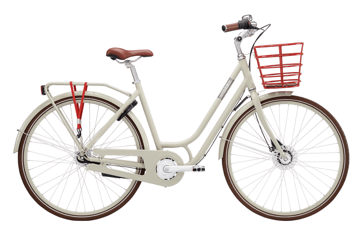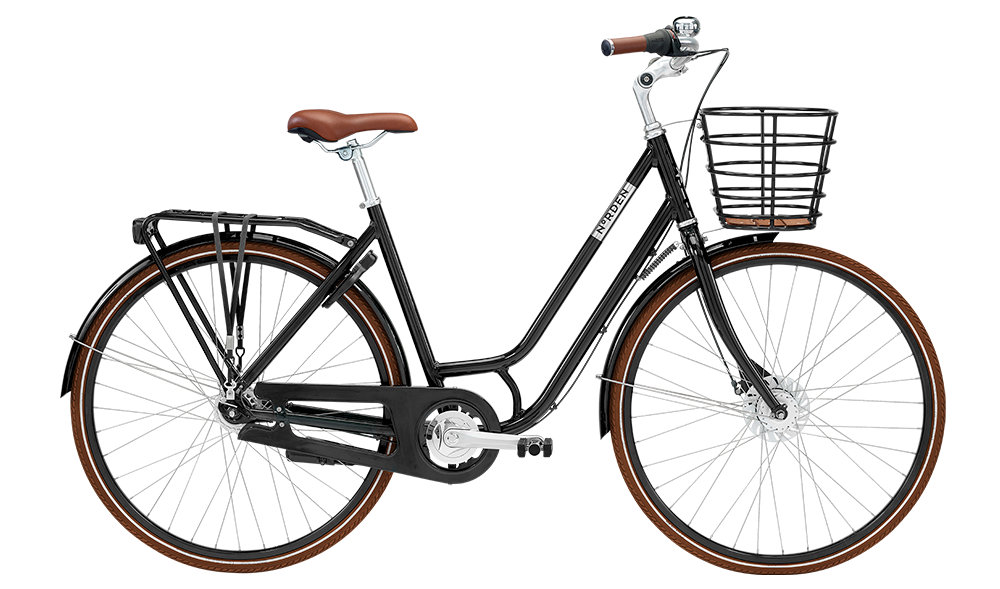 Du får 7 indvendige Shimano-gear samt både fodbremse og rullebremse. Leveres med kurv, bagagebærer/strop, støtteben, retroklokke, LED-baglygte, antipunkteringsdæk med refleks og godkendt lås.