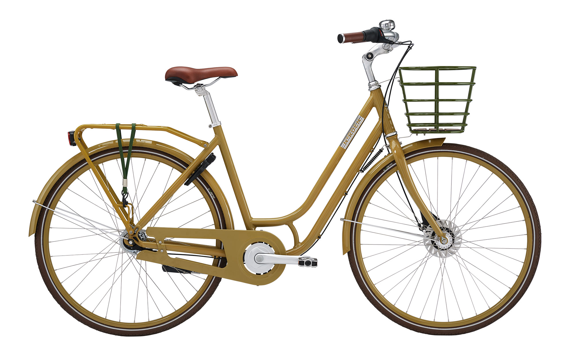 Du får 7 indvendige Shimano-gear samt både fodbremse og rullebremse. Leveres med kurv, bagagebærer/strop, støtteben, retroklokke, LED-baglygte, antipunkteringsdæk med refleks og godkendt lås.